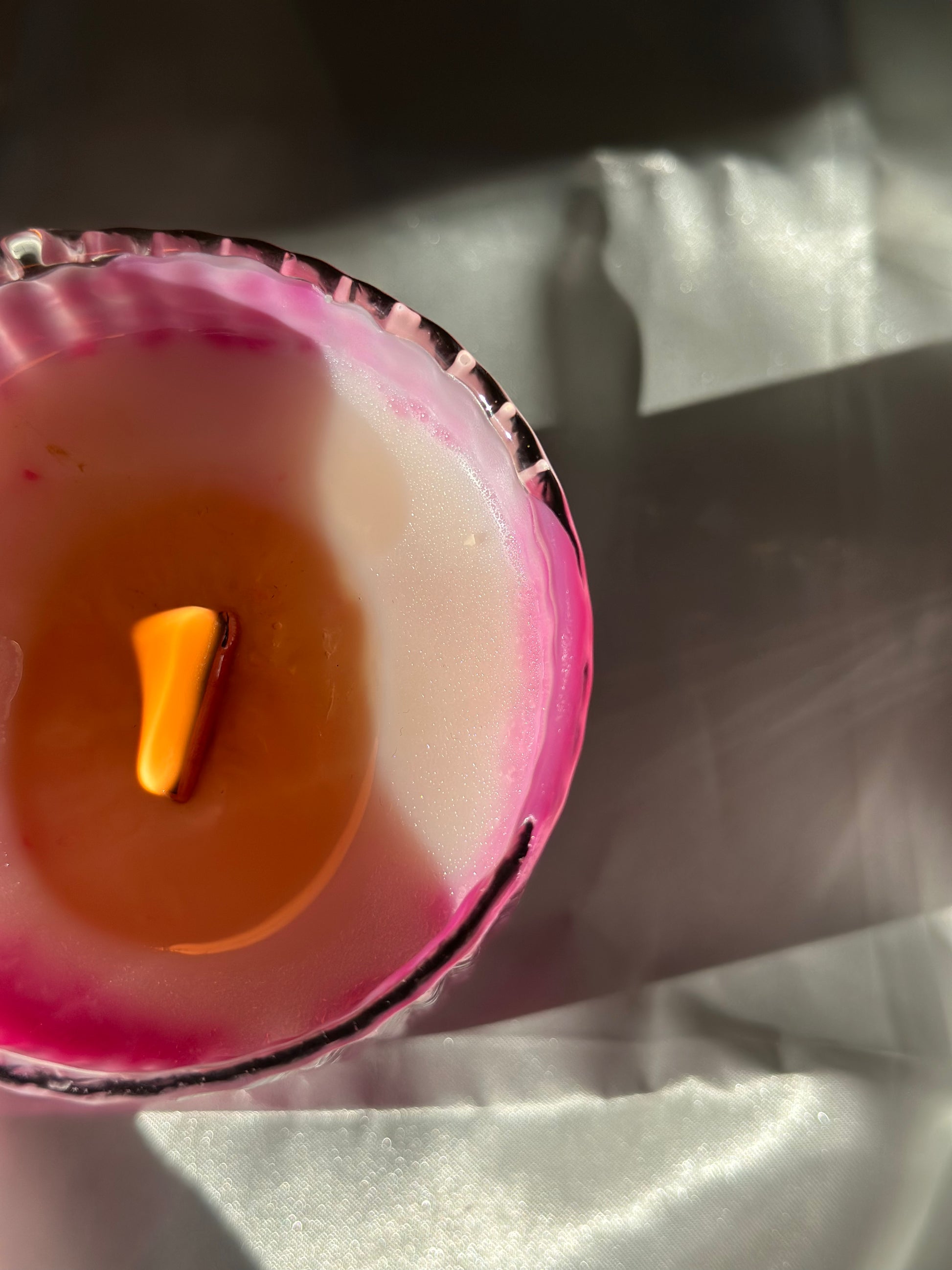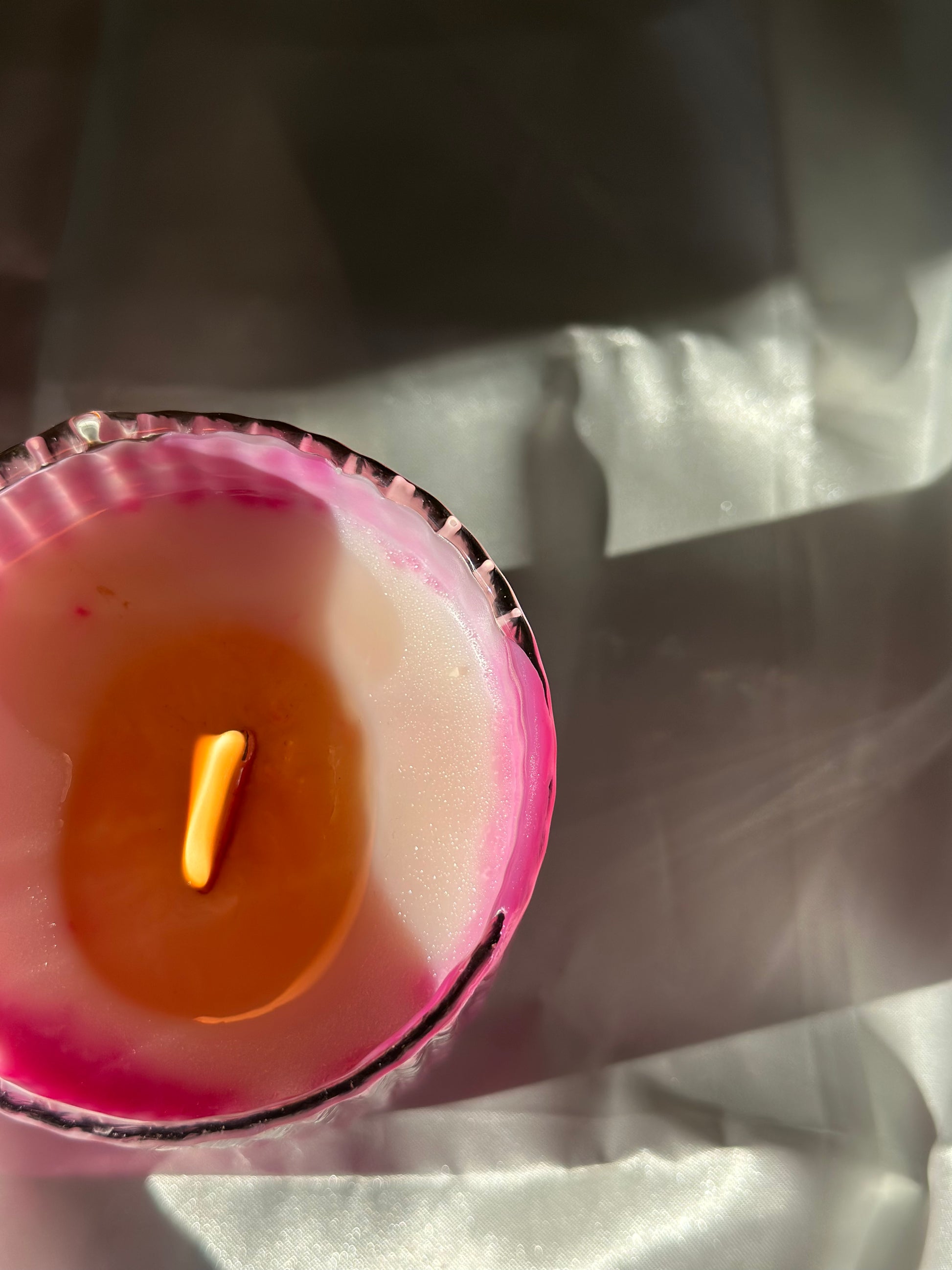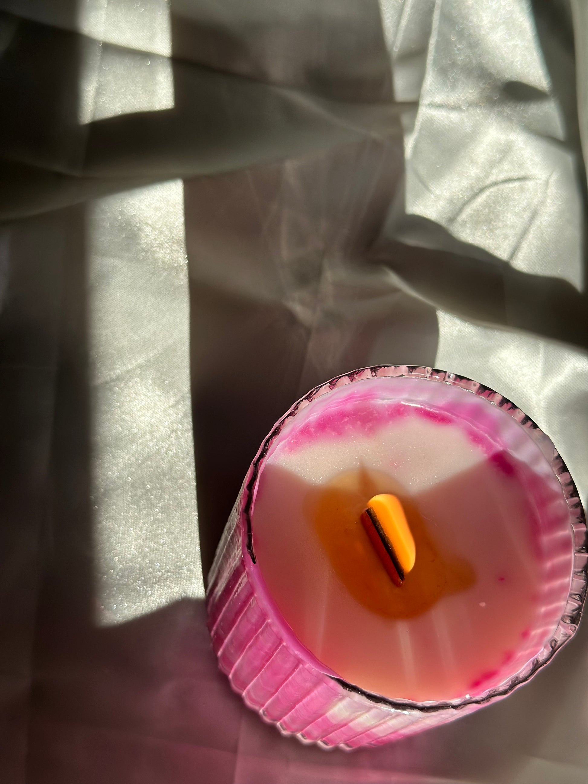 Halo captures the magic of the moment when light and color merge. Unlike other containers, its marbled finish isn't on the glass itself, but on the wax itself , hand-created for each piece. This gives each candle a unique pattern, a play of hues that come to life when the light passes through the glass.